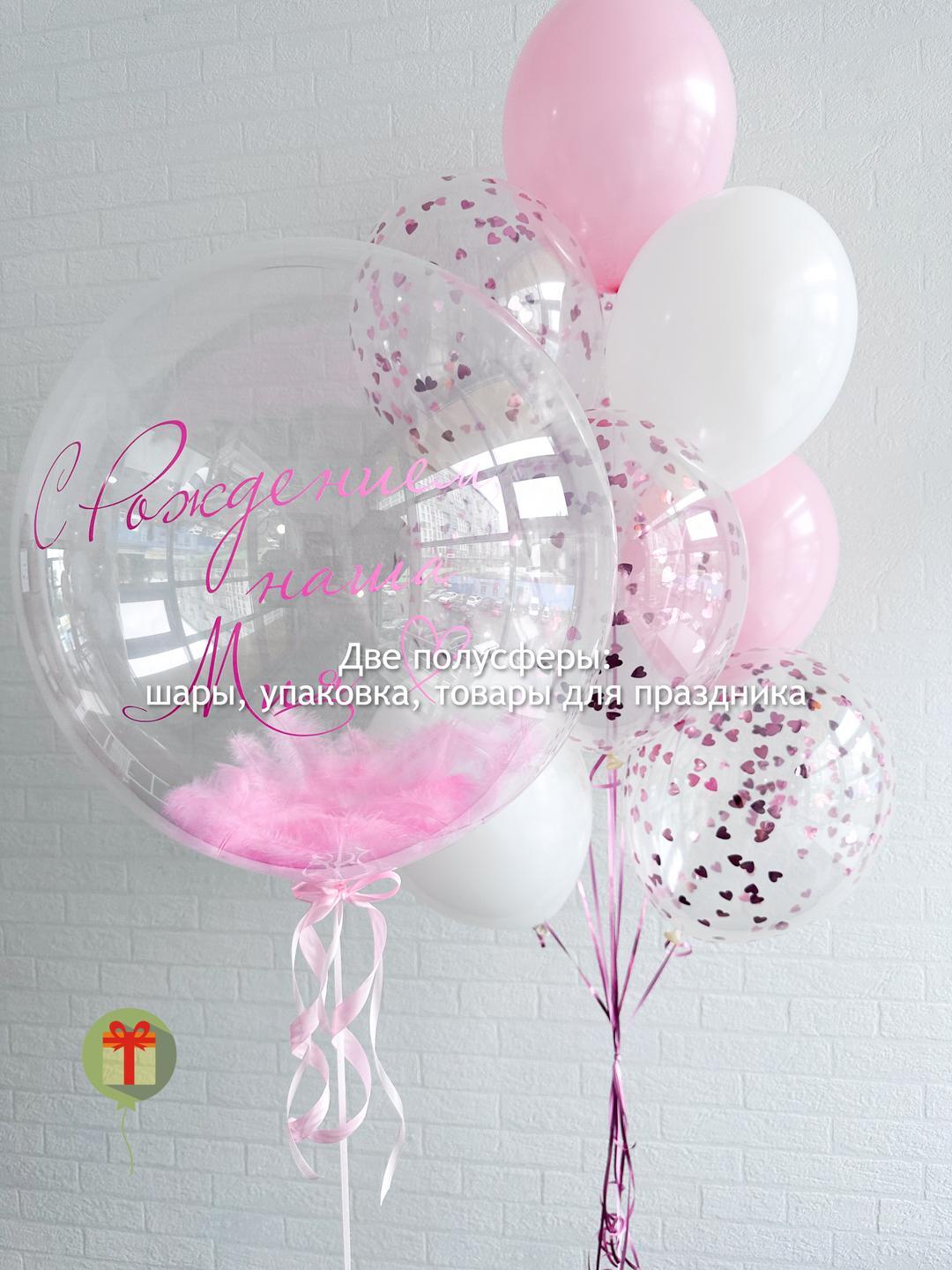 Сфера с индивидуальной надписью 60 см, фонтан из шаров 4 пастель 35 см  и 3 шаров с конфетти 35 см, грузики, пакеты