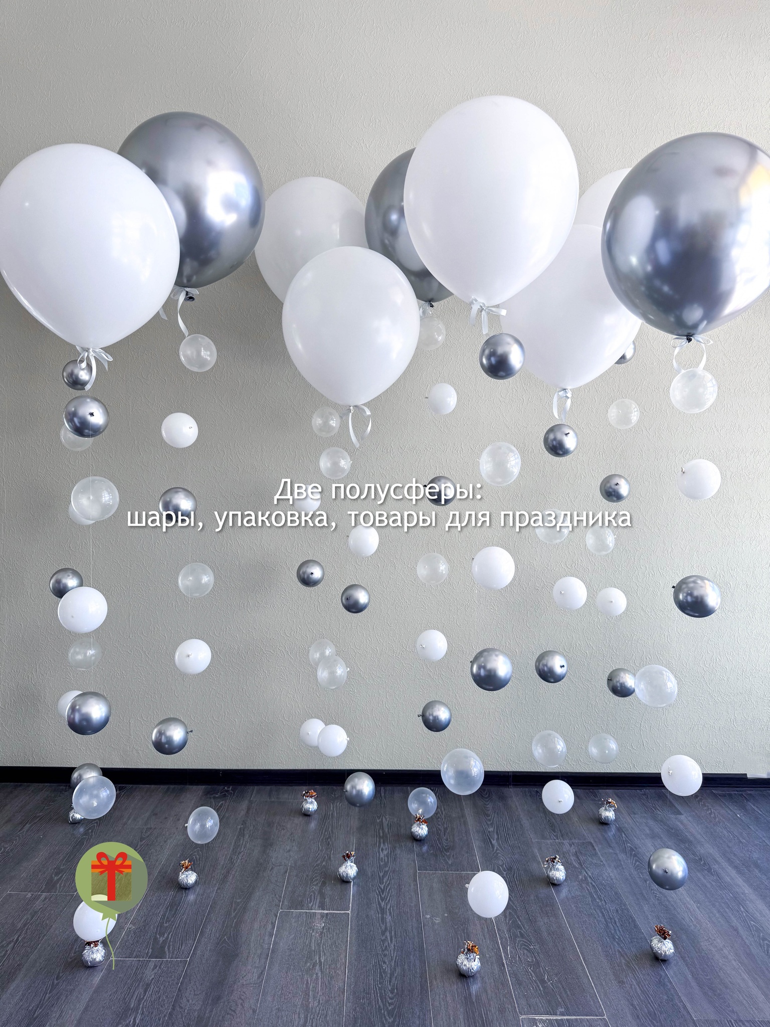 9 шаров 45 см на цепочке, 3 шара хром и 5 шаров пастель, грузик и пакет входят в стоимость.