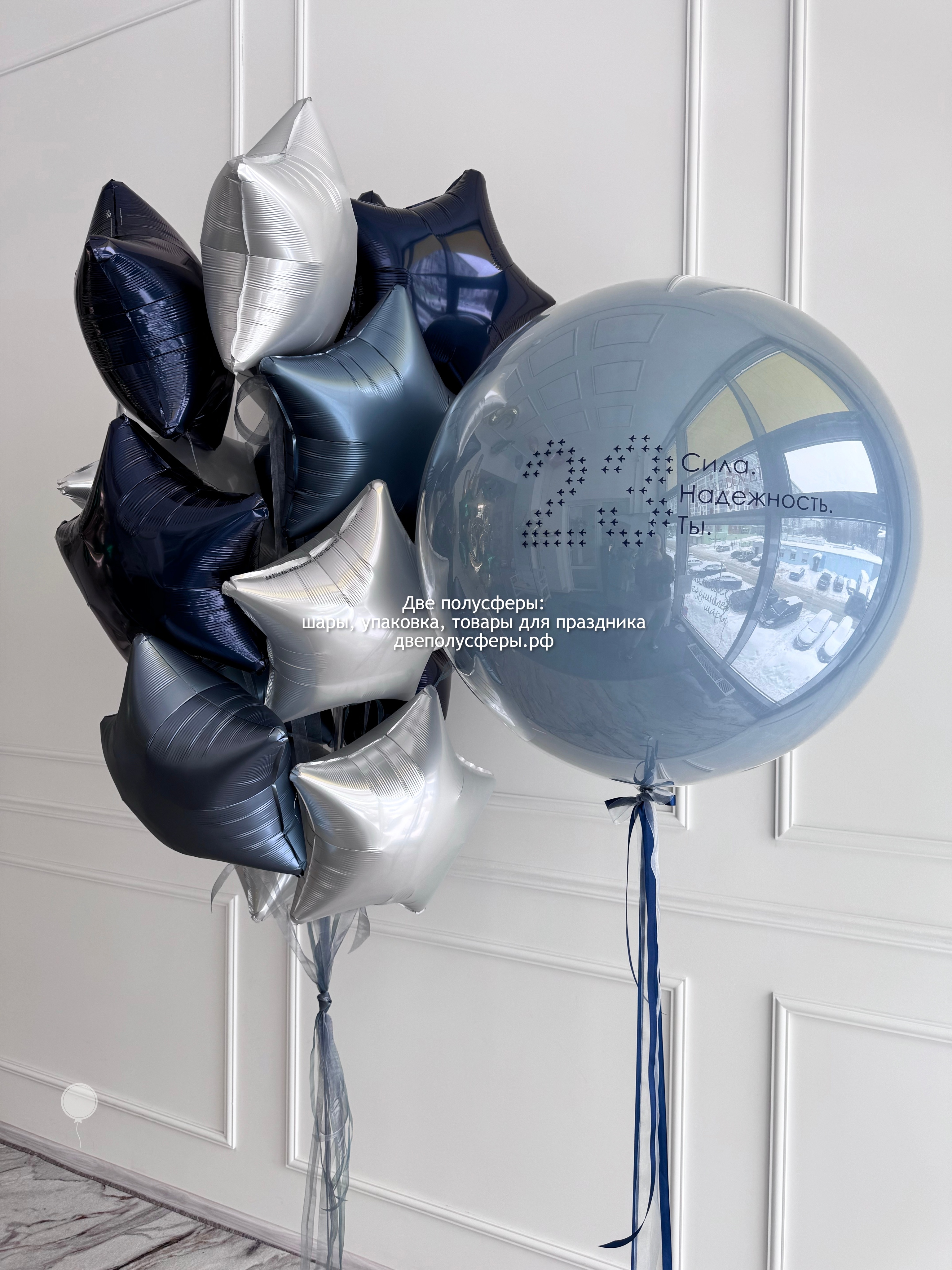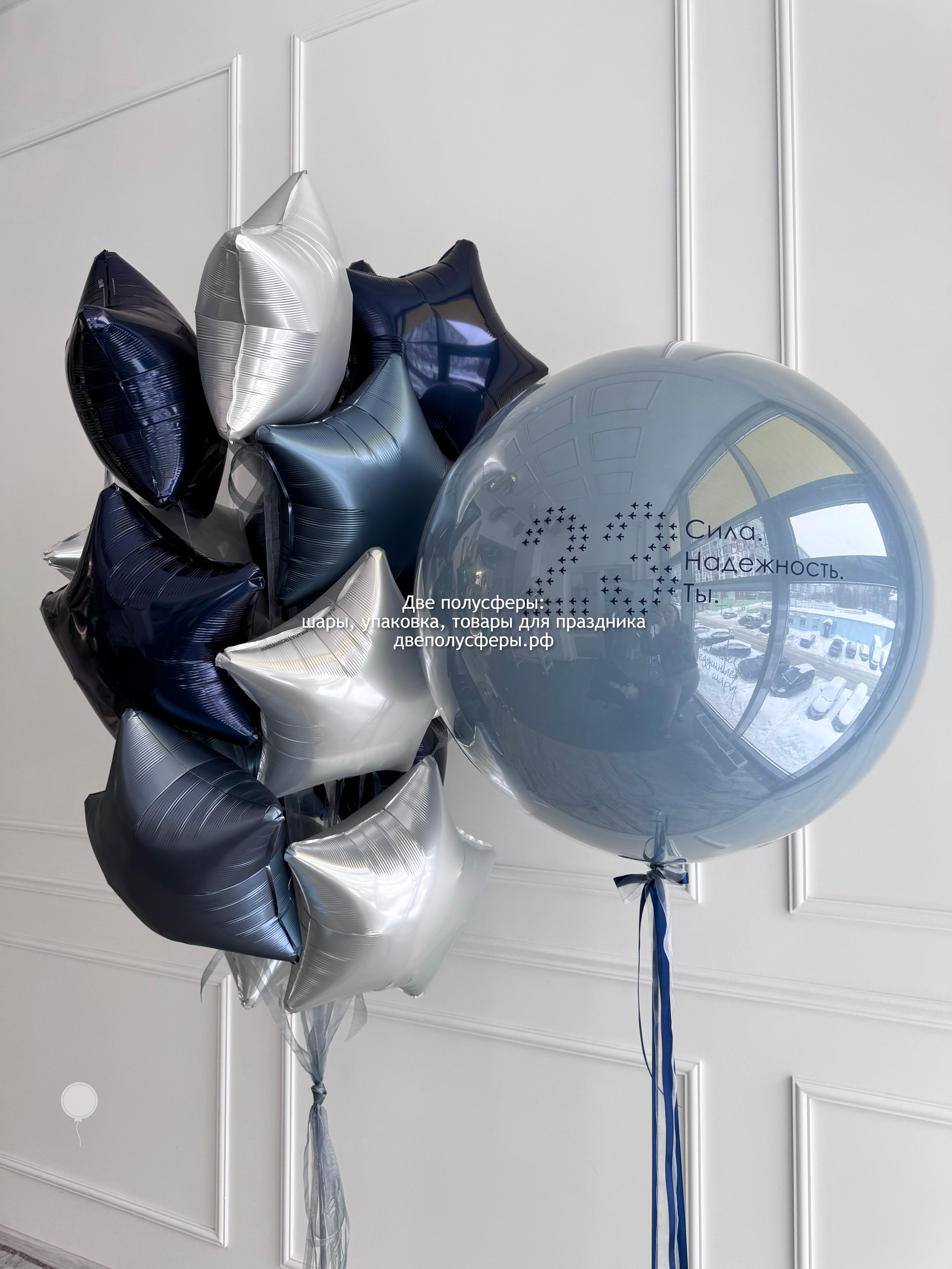 Стеклянный шар 60 см с надписью, фонтан из 15 звезд в синей гамме. Грузики и пакеты входят в стоимость