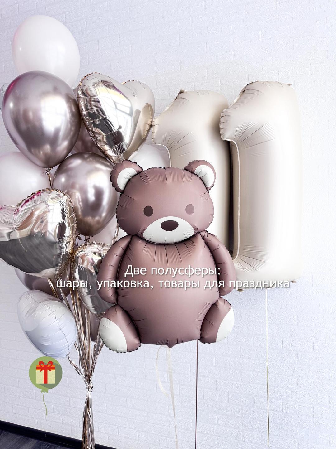 2 цифры 102 см в оттенке нюд, мишка из матовой фольги, фонтан из 5 сердец из фольги 45 см, 5 шаров хром 35 см, 5 шаров пастель 35 см, грузики, пакеты