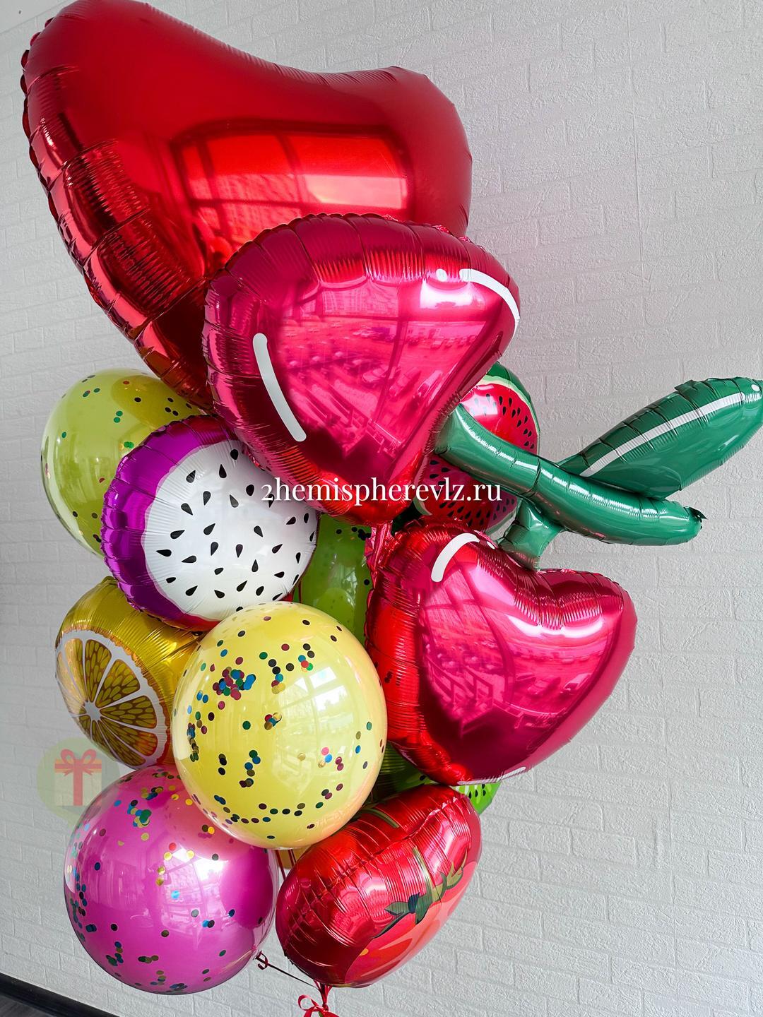 Шикарный фруктовый фонтан из 13 шаров. В составе: фольгированное сердце 60 см, фольгированная фигура вишни, 6 фольгированных шаров фрукты 45 см, 5 шар в шаре с конфетти. Грузики и пакеты включены в стоимость.