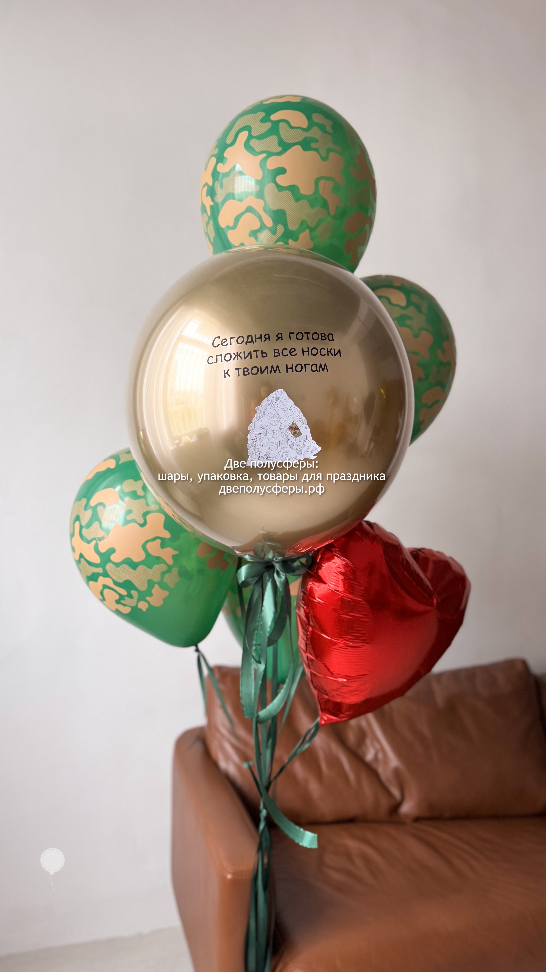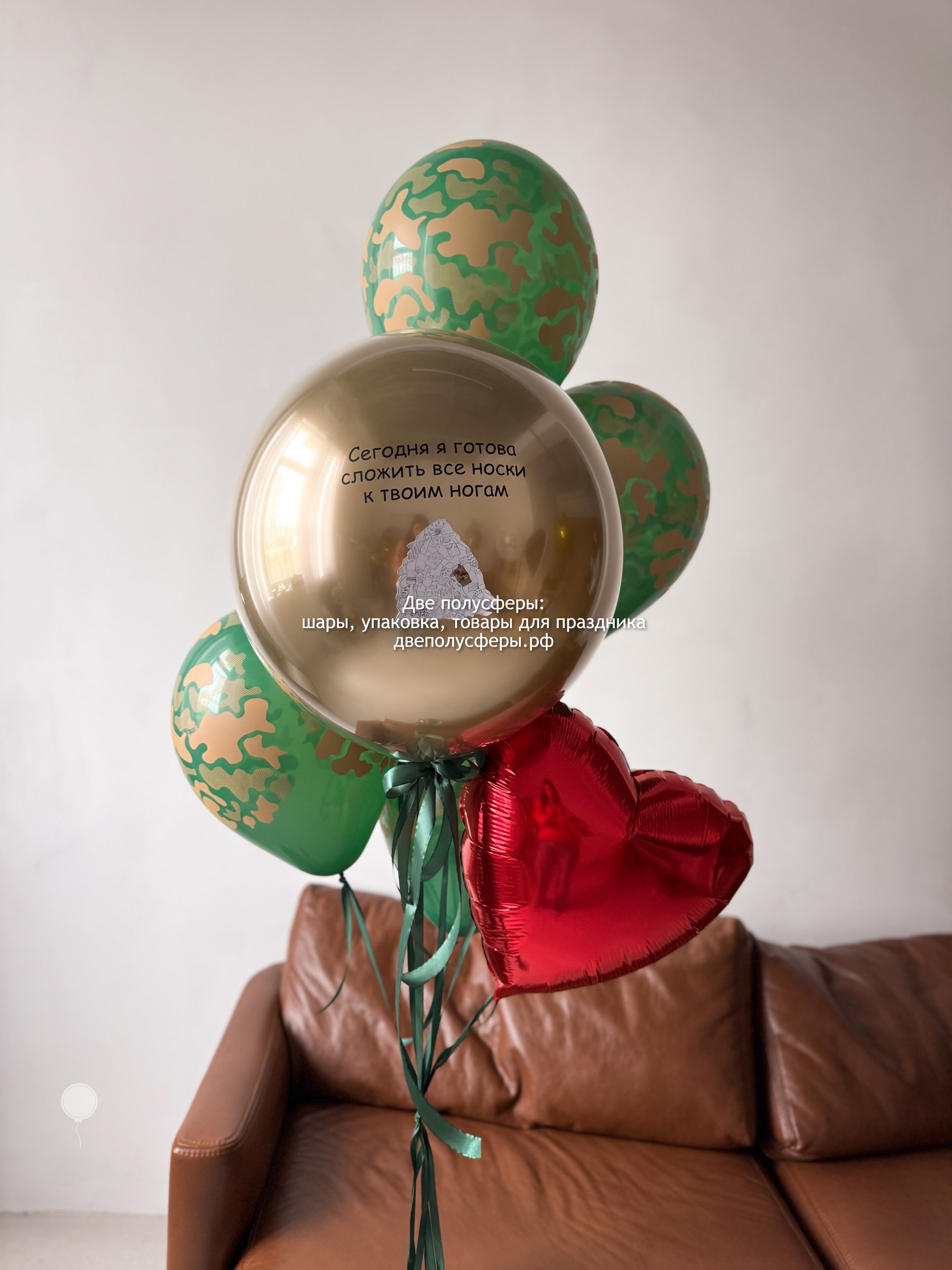 Фонтан из стеклянного шара 45 см с надписью, 5 шаров камуфляжных и красного сердца 45 см. Груз и пакет входят в стоимость
