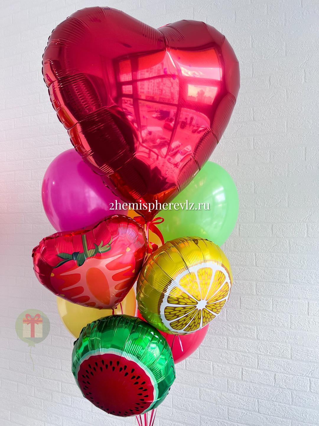Большой ,яркий, фруктовый фонтан из 10 шаров: фольгированное сердце 60 см, 3 фольгированных шара фрукты 45 см, 6 шаров пастель. Грузик и пакет включены в стоимость.