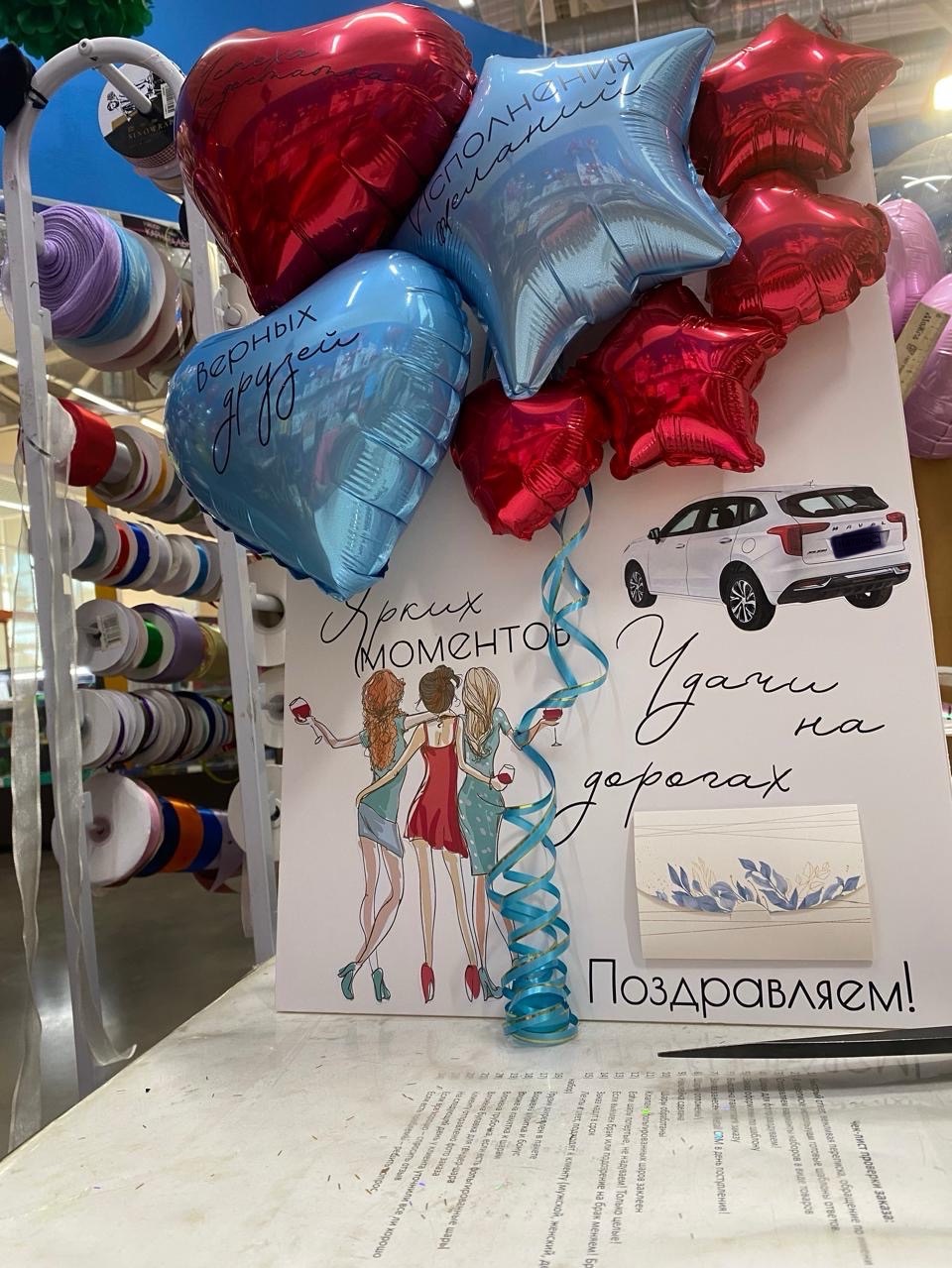 Открытка размером 35*50 см от подруг с поздравлением с покупкой машины