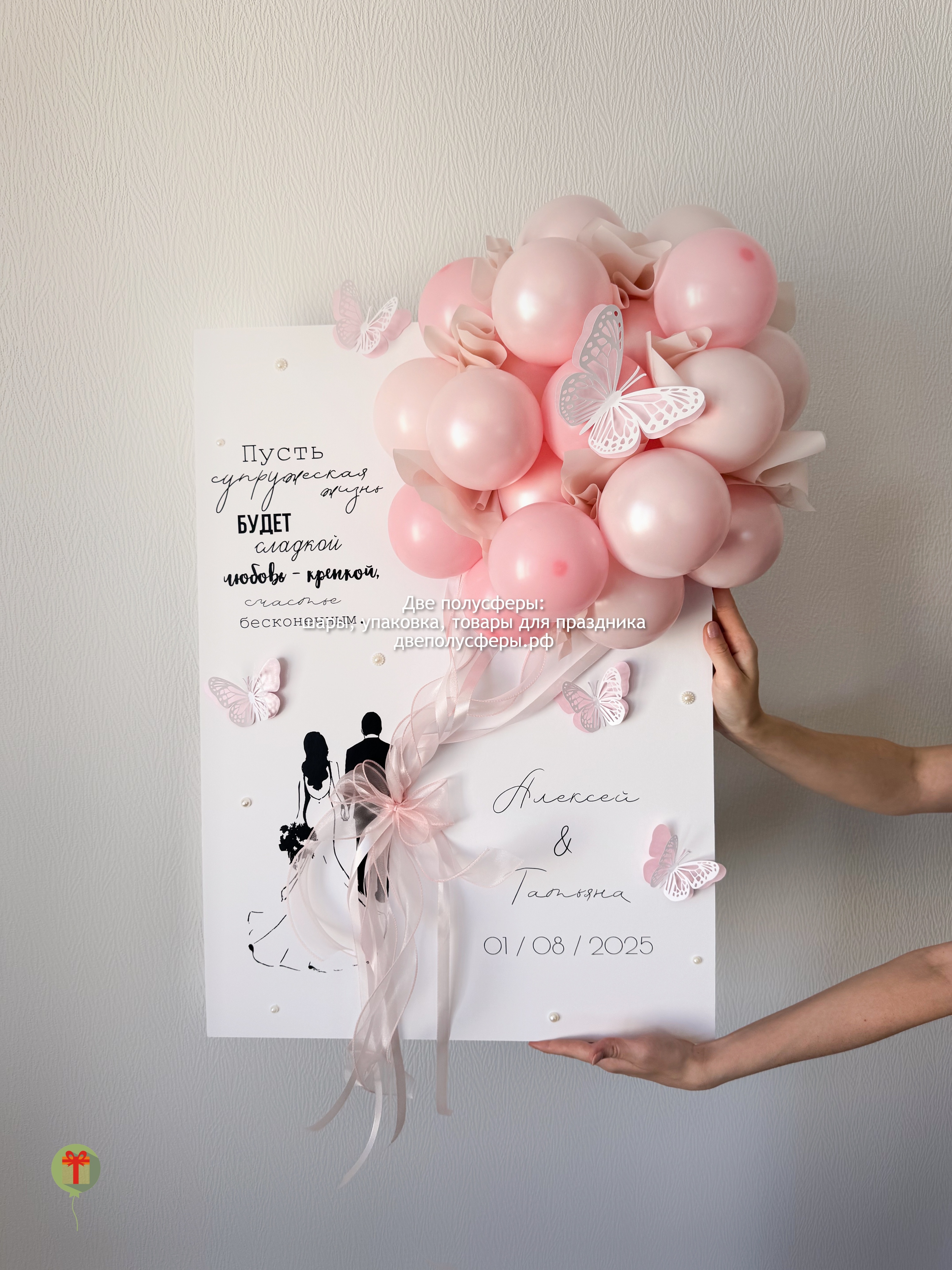 Открытка с шарами Свадебная пара в розовой гамме