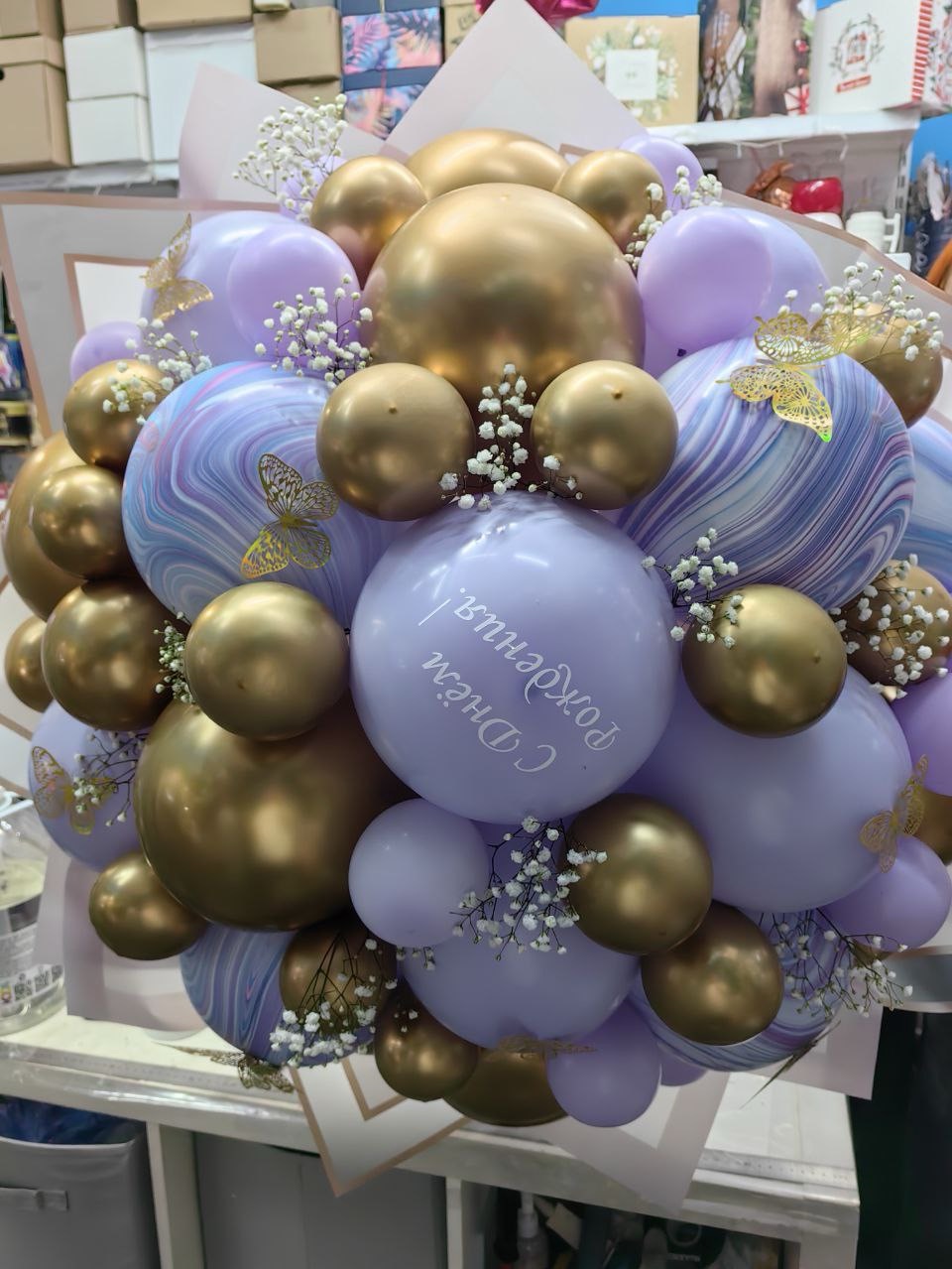 Дополнен надписями, свежей гипсофилой, бабочками
